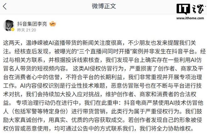 IT之家11月7日报道 抖音集团副总裁李亮昨天发文回应“演员文峥嵘被AI盗版贩卖”。李亮表示,经核实发现,被曝光的“三个直播间同时直播”的情况并未发生在抖音平台上。经联系相关方并根据投诉线索排查,我们发现平台上确实存在一些利用AI模仿明星带货的短视频内容。此类人工智能侵权假冒行为严重损害了创作者、商家和平台在消费者心目中的信誉,不符合平台的长远利益。我们高度重视,开展专项管理工作。他还表示,paAI内容侵权检测是行业技术难题,恶意假账号不断搞技术攻关平台上的对峙。我们将持续加大投入应对挑战,保护创作者、商家和消费者的合法权益。专项治理行动仍在持续进行中。我们在此表示:严禁抖音电商利用人工智能技术识别他人(包括军警等特定身份)进行产品营销。这种行为是严重的违法行为。 IT之家注意到,抖音电商安全信任中心于 9 月 2 日发布公告,关于加强人工智能内容滥用管理。公告称,平台已对违法视频和账号采取下架、注销等措施,并强调人工智能应用必须合规,任何误用或滥用行为将受到严厉处罚。具体表现如下: 少数商户利用人工智能技术生成虚假的产品展示、夸大的功能宣传内容,h 误导消费者购买,造成用户财产损失。利用人工智能生成虚拟人物来冒充真实身份,利用专家、名人的虚假人物来销售商品,破坏消费者信任并进行非法货币化。利用人工智能生成的虚假评论和产品详情页、直播间的用户体验操纵,故意制造虚假声誉,影响消费者的理性判断。