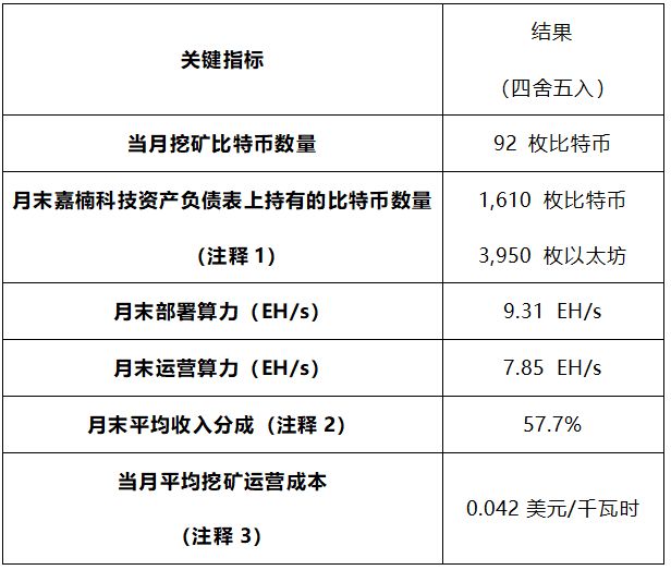 新加坡时间2025年11月12日,加密货币挖矿领域的创新公司嘉楠科技(can.us)发布了2025年10月未更新的比特币挖矿运营数据。嘉楠科技董事长兼首席执行官张南庚表示,“10月份,嘉楠科技印度运营增加了算力,装机容量比9月份更好。挖矿本身增加到约8.25 EH/s。清洁、低成本”比特币挖矿的电力,并推出了新一代比特币。 2. 指在适当的综合挖矿安排下,嘉楠科技将从总收入(如 ibaba 中定义)达到 100% 电力运行率中获得的加权平均份额。 2025 年 10 月 3 日挖矿基础设施更新(未研究) 当前挖矿项目(截至 2025 年 10 月 31 日) 4. 指理论上所有供电矿机可产生的总算力。 (包括采矿机可能会暂时离线)。 5. 指增强算力与已安装但尚未启用的算力(如有)之和。 6. 指已交付至各挖矿项目所在国但尚未安装的算力。 7. 指总安装算力和预期算力。最近的运营更新总结了该公司的消息:美国主要订单的胜利巩固了嘉楠科技在美国比特币挖矿复苏中的领导地位。 2025年10月2日,嘉楠耘智宣布收到美国比特币挖矿公司超过5万台Avalon A15 Pro矿机采购订单。这是该公司三年来最大的单笔订单。该批设备预计将于2025年第四季度交付,充分体现了嘉楠耘智在全球市场的技术领先地位以及美国采矿业的复苏势头。这个或der不仅体现了客户对嘉楠科技技术、效率和投资回报的高度认可,也进一步巩固了公司作为机构级挖矿首选供应商的地位。市场地位。加拿大天然气燃料转换试点于2025年10月13日启动,嘉楠耘智联合Aurora AZ Energy Ltd.在卡尔加里启动天然气计算转换项目,将价值超过200万美元的A15 Pro和模块化数据中心直接倾倒到天然气井口,产生约2.5兆瓦的补偿电力。该项目预计每年减少12000-14000吨当量二氧化碳排放,上线率高达90%,经济性优异,展现了公司在可持续能源和离网基础设施领域的领先布局。新一代Avalon A16系列于2025年10月28日全球首发。嘉楠耘智在迪拜Blockchain Life 2025上发布了Avalon A16系列。第一个风冷d A16XP 型号实现了 300 th/s 的计算能力和 12.8 J/Th 的能效。现已开放预购,全球生产基地同步发货,进一步强化“芯片-整机-自挖矿-库存币”一体化战略。 2025年10月16日再次遵守纳斯达克最低股价规定,嘉楠耘智美国存托股票(AD)连续十个交易日收于1.00美元以下,再次冲击纳斯达克最低股价要求,消除上市风险,彰显了资本市场对公司长期战略和执行力的信心。