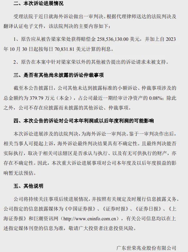 Shirong Zhaoye是广东珠海房地产公司的资深人士,已向前创始人Liang Jiarong提起了跨境诉讼,要求其收集28亿元人民币,该收款最近已完成。昨天(9月4日),广东西隆Zhaoye Co,Ltd发布了“宣布主要审判的发展”,指出美国接受法院最近要求Liang Jiarong在第一个判决中大约有219亿元人民币(RMB,RMB,RMB)。 Shirong Zhaoye与Huafafa Real Estate和Gree Real Estate一起被称为“ Zhuhai Real Estate的三枪手”。其创始人Liang Jiarong和他的父亲Liang Shezeng在2009年至2021年被评为Hurun名单上的最富有。后来,在2020年7月,公共安全器官要他“参与帮派”。他的家人持有的股票Rong Zhaoye,彼此冻结。在某个时候,Liang Jiarong家族搬到了美国。审查报告:广东一家上市房地产公司的前董事长参与了帮派! 500,000报告中的最高报告。从2021年9月开始,Shirong Zhaoye指责Liang Jiarong及其近亲在全国一家加利福尼亚州的一家加利福尼亚法院非法预防公司所有权,并且收债费用从2021年的6.5亿元增加到了2021年的6.5亿元到2022年的28亿元。直到最近,首次判决的第一名才正式释放。 Shirong Zhaoye于9月4日发出的通知指出,美国接受法院最近在国外审判的第一年做出了酌处权。原告(即Shirong Zhaoye)必须获得258,536,130美元的付款补偿,或者从被告Liang Jiarong的大约18.5亿元人民币中获得了18.5亿卢比;并将计算的利息添加到US $ 70,831从2023年10月30日起,每天为.81,相当于当天至日期的利息约为506,000元。基于9月3日的总共674天,仅利息约为3.4亿元人民币。两个项目的总数约为21.9亿元人民币。但是,在这种情况下,Shirong Zhaoye对Liang Jiarong以外的其他被告提起的诉讼受到支持。 Shirong Zhaoye于9月4日发布的宣布公告的屏幕截图,但是,Shirong Zhaoye表示,法院参与此诉讼的判决是对外国审判的首次审判的判决。只要在首次录制判决之后,相关各方可能会提出上诉,海外审判的最终酌处权是不确定的。而且,如果最终的酌处权实际上可以实施,则取决于该管辖区是否被承认和执行,以及是否拥有实施权,也存在不确定性。因此,小鬼这一基本收益的制定是关于公司本年度和随后几年的收入和损失的行为是不可预测的。在这一公告中,希隆Zhaoye还透露,尚未达到披露标准的其他小型公司索赔和仲裁对象中涉及的总金额约为37.99亿(本金),占公司最新审计净资产的0.08%。根据Shirong Zhaoye的2025年半年度报告,在今年上半年,Shirong Zhaoye的营业收入为5.98亿元人民币,同比增长9.8%;与股东相关的净利润为1529万元人民币,减少了44.4%的一年;与股东相关的净利润为1455万元人民币,减少了46.1%的一年;净营业现金流量为负2.18亿元,一年一年;增加了53.8%。到第二季度末,Zhaoye的总拥有量为73.12亿元人民币,增加了O从去年年底开始f 0.5%;与股东相关的净资产为47.99亿元人民币,比去年年底增加了0.3%。在报告期间,Zhaoye的建筑区域为410,000平方米,Realestate预售(销售)面积为44,000平方米,预售(销售)价值为5.15亿元。值得注意的是,9月4日,Shirong Zhaoye发布了一份宣布,该消息称由行政状况和行政委员会拥有,将在国有的Zhuhai Zhuguang集团中将90.21%的股权转移到Zhuhai Dahengqin Group,Ltd.。因此,Zhuguang团队并未直接持有Zhuhai Dahengqin Anju Investment Co,Ltd(因此从称为“ Anju Company”)持有的公司股票的60.28%,这是一个全拥有的Dahengqin集团。这意味着,去年,Zhaoye的主要股东完成了从Liang Jiarong到州Ju-Ju公司的转型,然后再转变为一群国有的Zhugua。ng。 《商人神话》下的影子:“阴影中最富有的人”和“黑人帝国”的成功的历史曾经被认为是反击草的模型,它与电视连续剧《疯狂》和实际上相当。在1980年代,Liang Jiarong从高中毕业后去了澳门工作并积累了资本。 1993年,他回到了Zhuhai City Doumen County的Zhuhaii房地产开发公司。它开发了著名的房地产项目,例如里维埃拉(Riviera),西隆明苏(Shirong Mingzhu),希恩(Shirong)蓝湾半岛(Shirong Blue Buhe Peninsula),并与Huafareal Estate和Gree Real Estate一起被称为“ Zhuhai Real Estate的三枪手”。 Shirong Zhaoye图片来源的财产:Shirong Zhaoye官方网站Liang Jiarong本人很长时间且在幕后很长一段时间,将他的父亲Liang她推到了70岁以上,直到舞台前。很长一段时间以来,Zhaoye的股权结构如下:Liangshe IncreASED她的53.57%股份,Liang Jiarong持有20.15%的股份。尽管他担任Shirong Zhaoye董事长,但Liang Jiarong在房地产行业的痕迹很少。直到今天,互联网上的他的照片通常是一个带有同名和姓氏的香港乡下人的照片。 2009年,现年77岁的Liang Shezeng赢得了第一批Hurun上市,其净额为27亿元人民币(RMB,都在伊巴巴)。朱海市的公民只发现朱海的新富人是来自杜登区Qianwu镇Qiandong村的一位老农民。在接下来的13年中,Liangshe已在40亿至60亿元人民币的净名单上列出,这已成为Hurun Rich列表中最古老的常客。当它在2021年上次上市时,梁·谢兴(Liang Shezeng)和莉安格·贾朗(Liang Jiarong)和他的儿子在48亿元人民币的名单中排名1483。但是,在吸引力的背后 - 是一个很大的阴影。 2016年7月早些时候,Liang Jiarong被置于公共安全风琴的住所下S用于怀疑洗钱。 2020年7月,在瓜海市与有组织犯罪作斗争的特别运动中的新闻发布会揭示了Liang Jiarong的另一面。根据广东省公共安全部门的通知,Si liangjiarong在Sinakop Ang Mga Magagukukunan Ng Dagat Sa Doumen区 sinasadyang pinsala, iligal na pagmimina, at iligal na pagsakop sa lupang pang -agrikultura, at ninakawan at sinakop ang mga mapagkukunan ng Marine sa sea area.Monopolize the bass breeding market, 